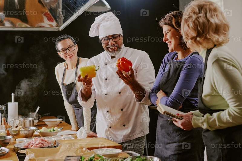 Мужчина средних лет преподает занятия по кулинарии различным женщинам на кухне