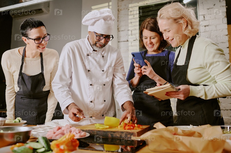 Мужчина средних лет преподает занятия по кулинарии различным женщинам