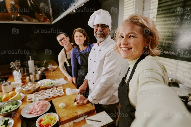 Разнообразная группа взрослых людей среднего возраста посещают занятия по кулинарии вместе, улыбаясь