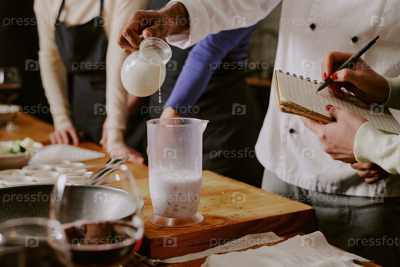 Группа молодых взрослых кавказских поваров, посещающих уроки кулинарии и измеряющих ингредиенты