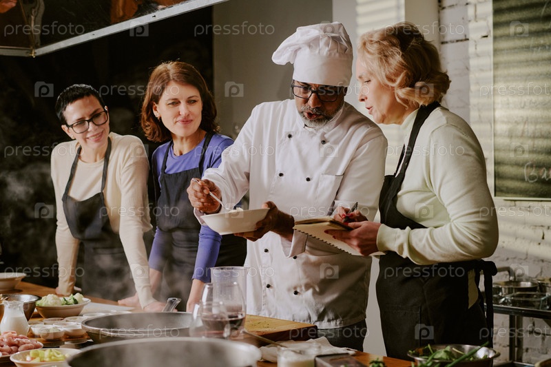 Мультиэтническая группа среднего возраста изучает методы приготовления пищи во время занятий