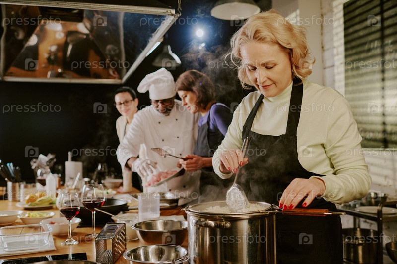 Кавказская женщина среднего возраста, готовящая с различной группой во время урока кулинарии