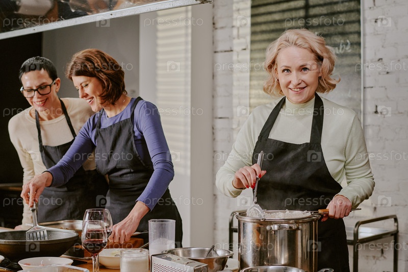 Кавказская женщина средних лет ведет занятия по кулинарии с разными взрослыми, улыбающимися