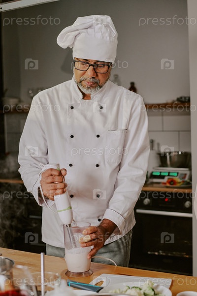 Повар среднего возраста мужского пола, смешивающий ингредиенты во время мастерской по приготовлению пищи
