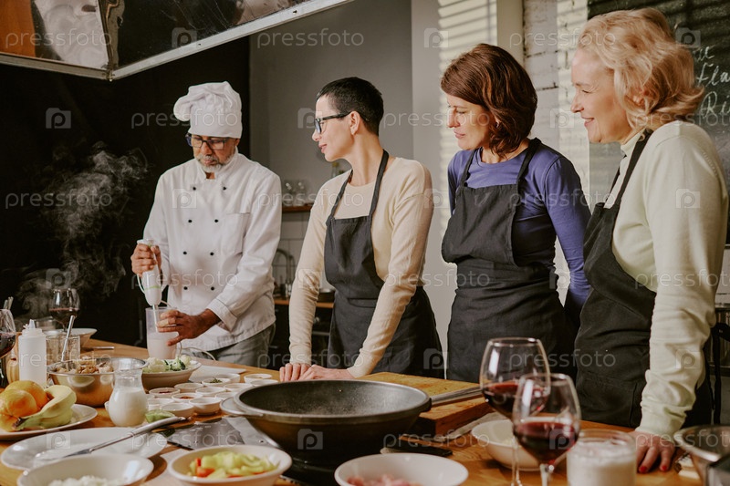 Повар среднего возраста преподает мультиэтническим женщинам методы приготовления пищи во время занятий