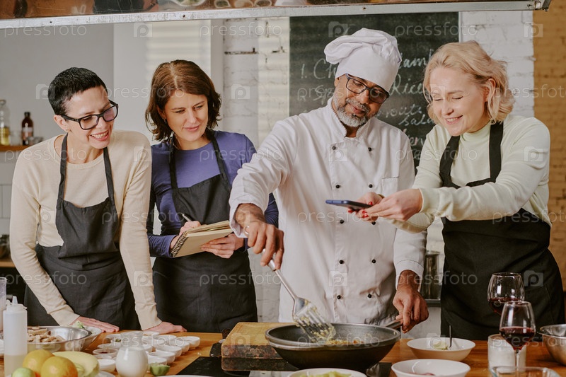 Разнообразная группа взрослых посещает занятия по кулинарии с шеф-поваром, демонстрирующим технику