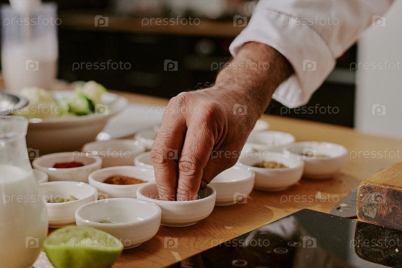 Мужчина средних лет, готовящий пряности во время занятий по кулинарии