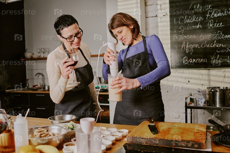 Две белые женщины средних лет, готовящие соус во время урока кулинарии