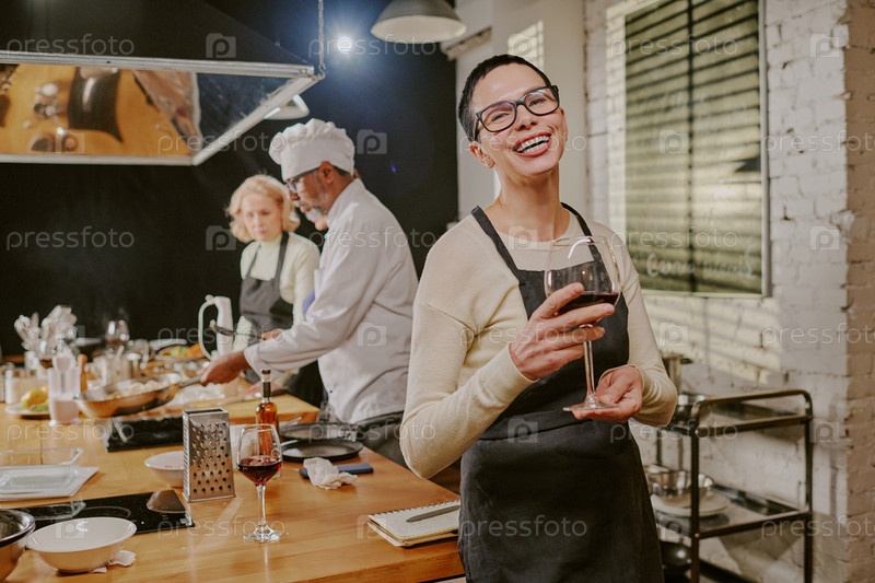 Улыбающаяся белая женщина держит винный стакан во время урока кулинарии
