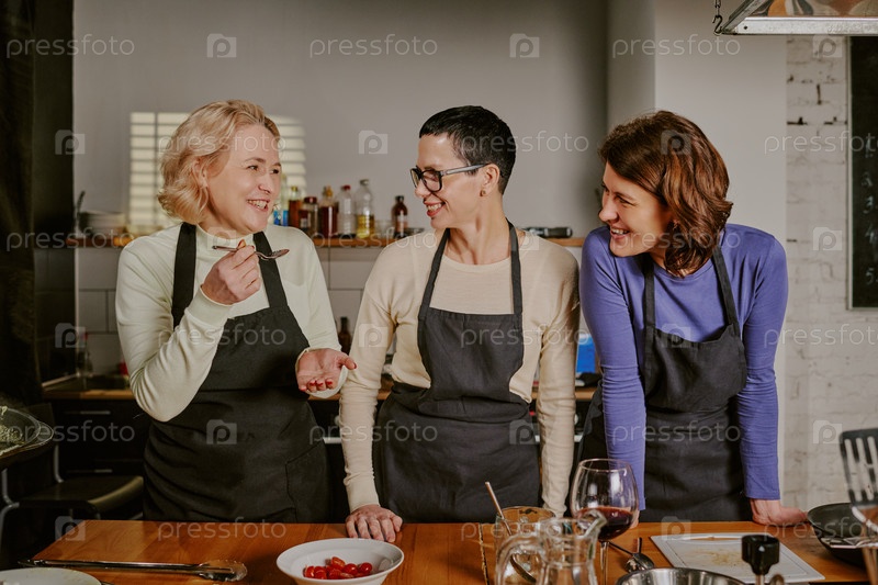 Три белых женщины среднего возраста, улыбающиеся и взаимодействующие во время урока кулинарии