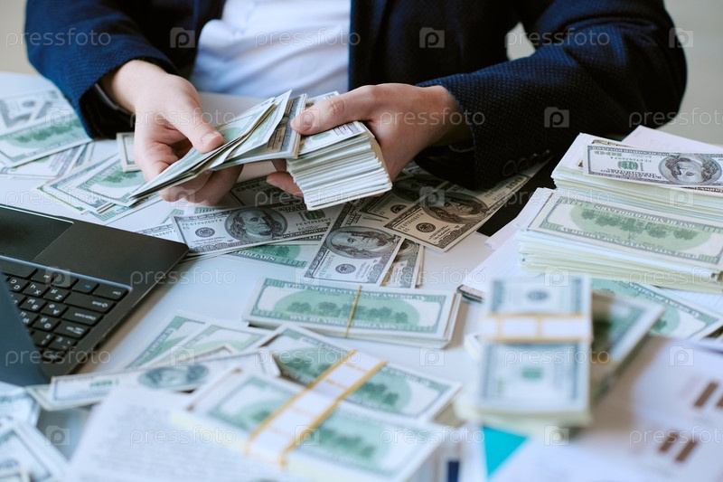 Кавказский молодой взрослый мужчина считает долларовые банкноты на рабочем столе