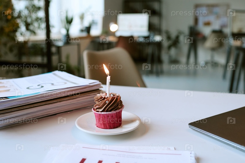 Шоколадный кекс с горящей свечой, стоящий на тарелке в современном офисе