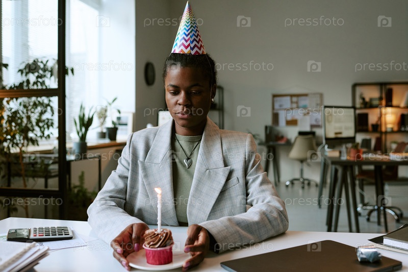 Взрослая черная женщина, носящая партийную шляпу Молодой человек сидит в одиночестве и празднует день рождения