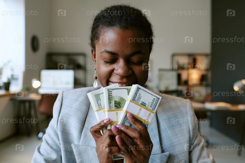 Портрет молодой взрослой чернокожей женщины, улыбающейся в то время как она держит пучки наличных