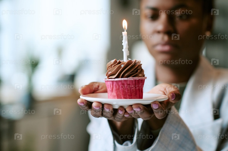 Молодая взрослая черная женщина держит шоколадный кекс с зажженной рождественской свечой