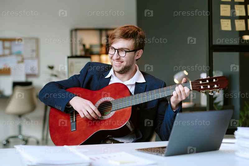 Кавказский молодой взрослый мужчина играет на акустической гитаре, сидя за столом и улыбаясь