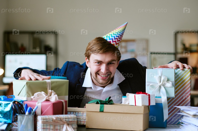 Портрет молодого белого мужчины, празднующего день рождения в окружении коробки с подарками