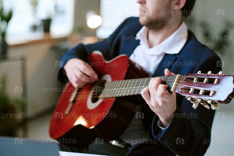 Кавказский молодой взрослый мужчина играет на акустической гитаре в помещении днем