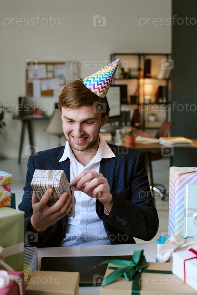 Вертикаль молодого человека, носящего партийную шляпу и открывающей подарочную коробку во время празднования