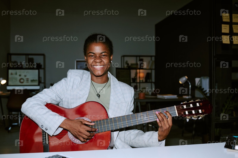Портрет молодой взрослой чернокожей женщины, улыбающейся, играя на акустической гитаре