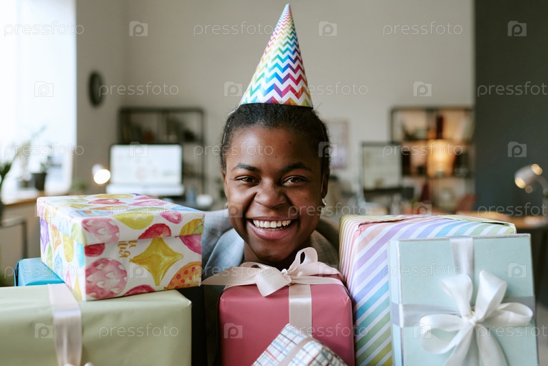 Портрет молодой взрослой чернокожей женщины, улыбающейся во время празднования дня рождения в помещении