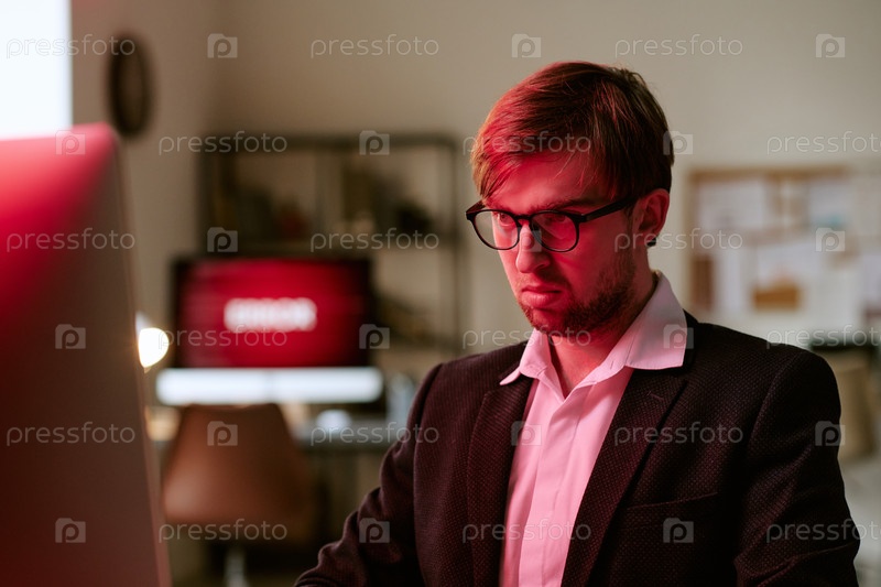 Молодой белый мужчина с очками работает на компьютере в офисной обстановке