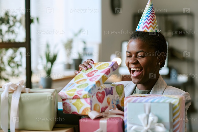Молодая взрослая чернокожая женщина улыбается, открывая коробки для подарков на день рождения в помещении