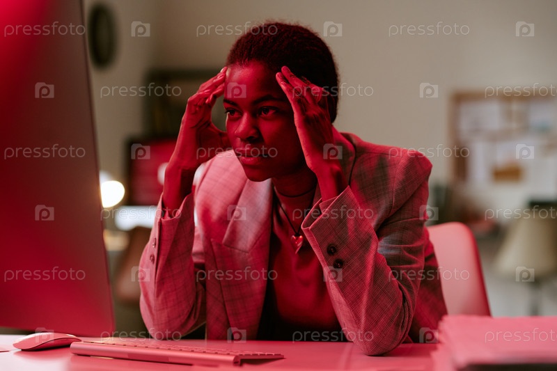 Молодая взрослая чернокожая женщина концентрируется, работая на компьютере в офисе