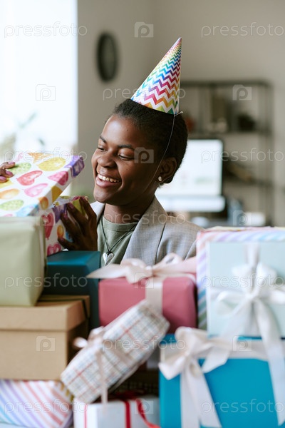 Вертикаль чернокожей женщины, улыбающейся во время получения подарков на день рождения на праздновании