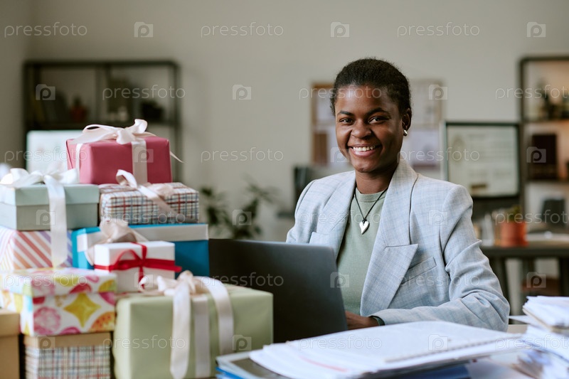 Портрет молодой взрослой чернокожей женщины, улыбающейся во время работы с коробками для подарков