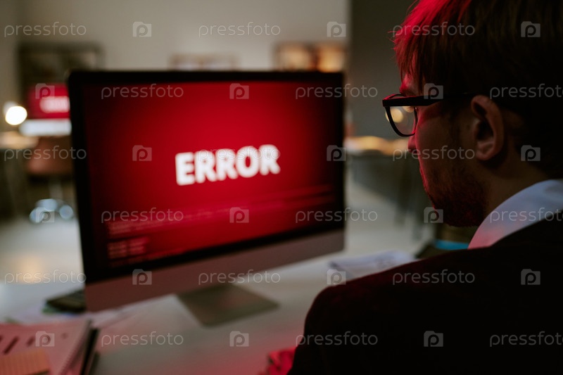 Кавказский молодой взрослый мужчина сталкивается с экраном компьютера, отображающим сообщение об ошибке