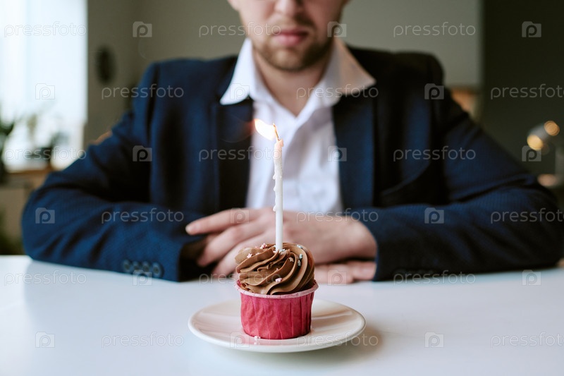 Молодой белый мужчина сидит один и смотрит на кекс с горящей свечкой