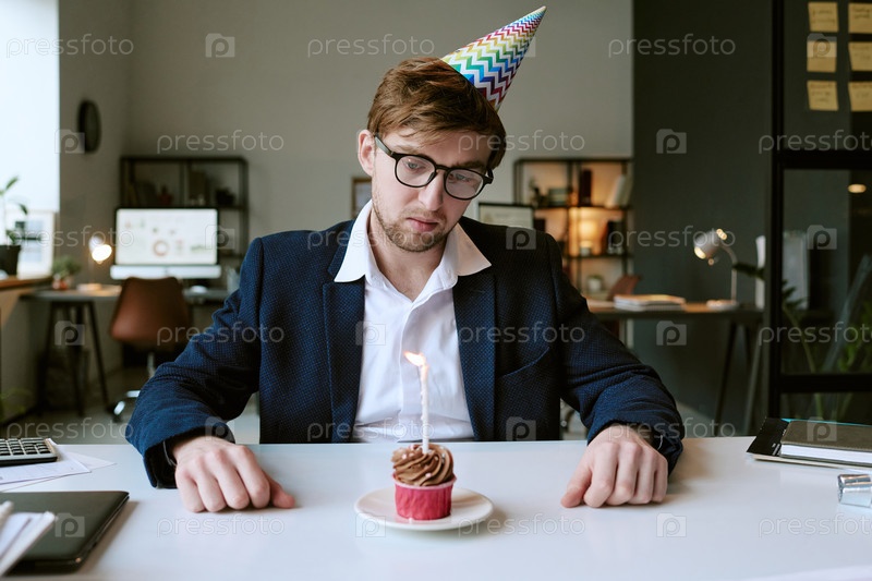 Кавказский молодой взрослый мужчина носит партийную шляпу сидит один празднует день рождения