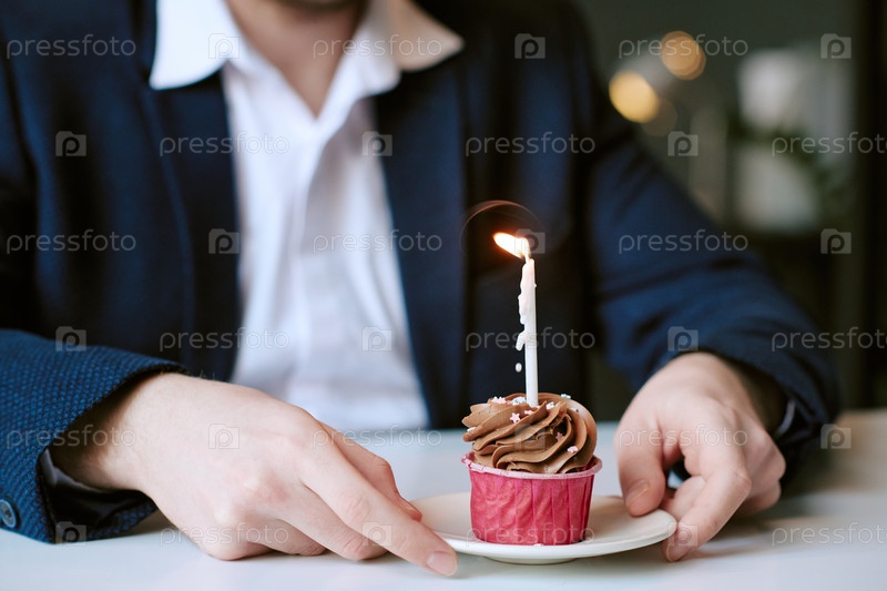 Молодой белый мужчина держит кекс с горящей свечой, празднуя день рождения