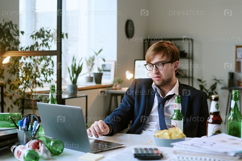 Молодой белый мужчина работает за столом, окруженный бутылками пива в офисе