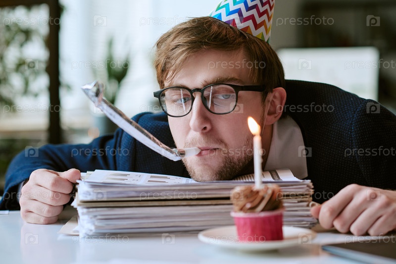 Молодой кавказский мужчина, носящий шляпу для вечеринки, дующий шумный производитель, празднующий день рождения