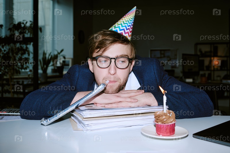 Молодой белый мужчина, носящий партийную шляпу сидит за столом и празднует день рождения