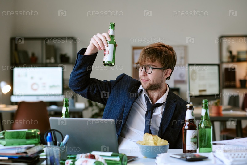 Молодой белый мужчина сидит за рабочим столом и пьет пиво, работая на ноутбуке