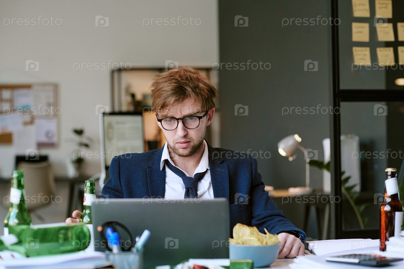Молодой белый мужчина работает за столом, окруженный бутылками пива и закусками