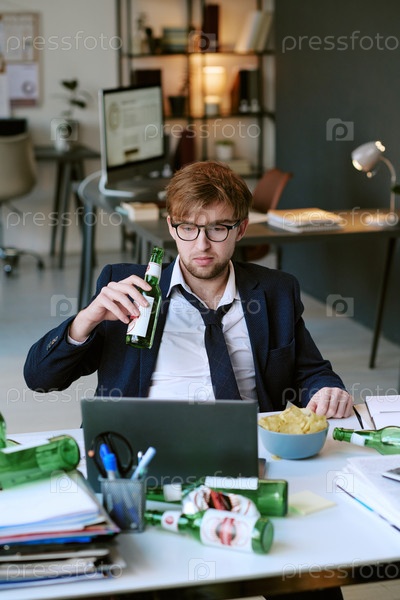 Вертикаль молодого человека, пьющего пиво во время работы на ноутбуке в офисе