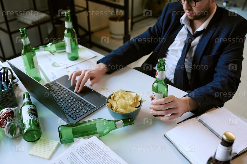 Молодой белый мужчина работает на ноутбуке, выпивая пиво в офисной обстановке