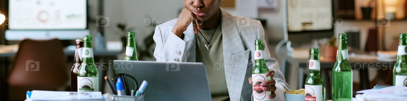 Заголовок молодой чернокожей женщины, работающей на ноутбуке в окружении бутылок пива внутри