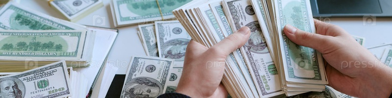Заголовок Человек организует большие пучки долларовых банкнот в помещении