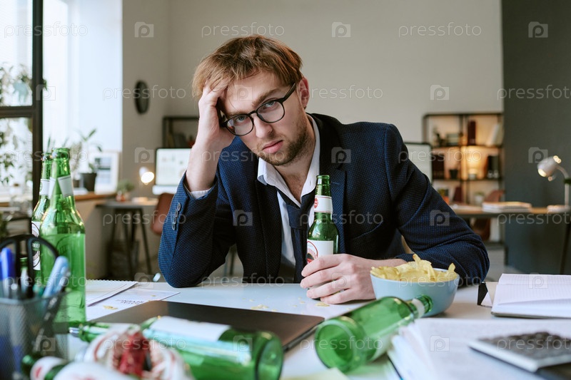 Молодой белый мужчина сидит за рабочим столом, пьет пиво и выглядит напряженным