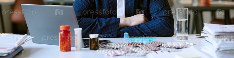 Голова человека, сидящего за рабочим столом в окружении различных лекарств