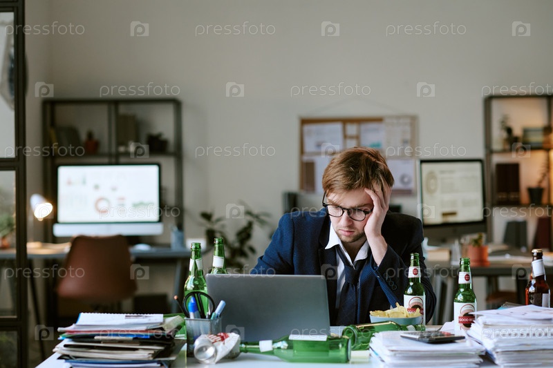 Молодой белый мужчина сидит за столом, работает допоздна в окружении бутылок пива