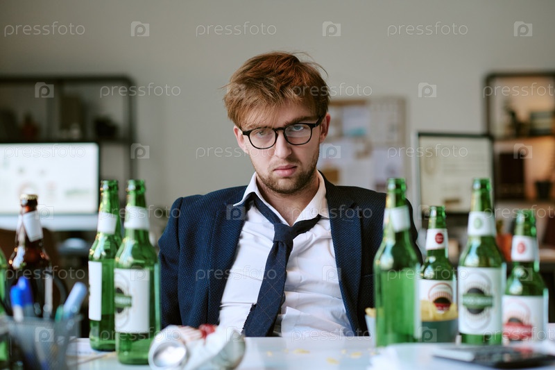 Молодой белый мужчина сидит за рабочим столом, окруженный пустыми бутылками с пивом