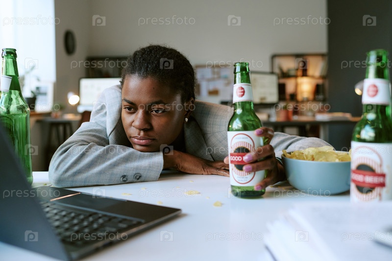 Молодая взрослая чернокожая женщина смотрит на экран ноутбука, выпивая пиво в помещении