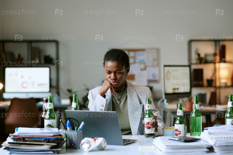 Молодая взрослая чернокожая женщина, работающая удаленно за рабочим столом в окружении бутылок пива