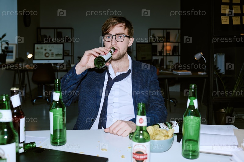 Молодой белый мужчина пьет пиво один за столом в офисе ночью